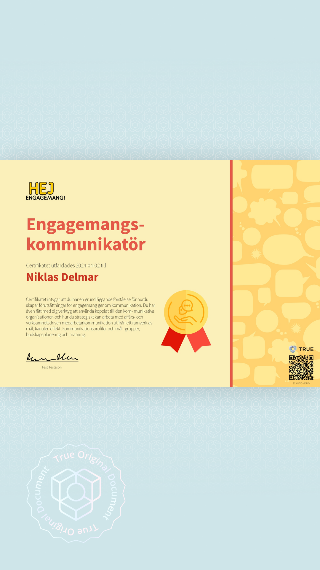 TRUE -dokument kan enkelt delas vart du vill genom att klicka på delningsknapparna bredvid dokumentet. Du kan också lägga till det på din LinkedIn-profil, skicka det via e-post, ladda ner som PDF, eller spara länken som bokmärke på din dator. Alla dokument är verifierbara och säkra, både digitalt- och utskrivna på papper.